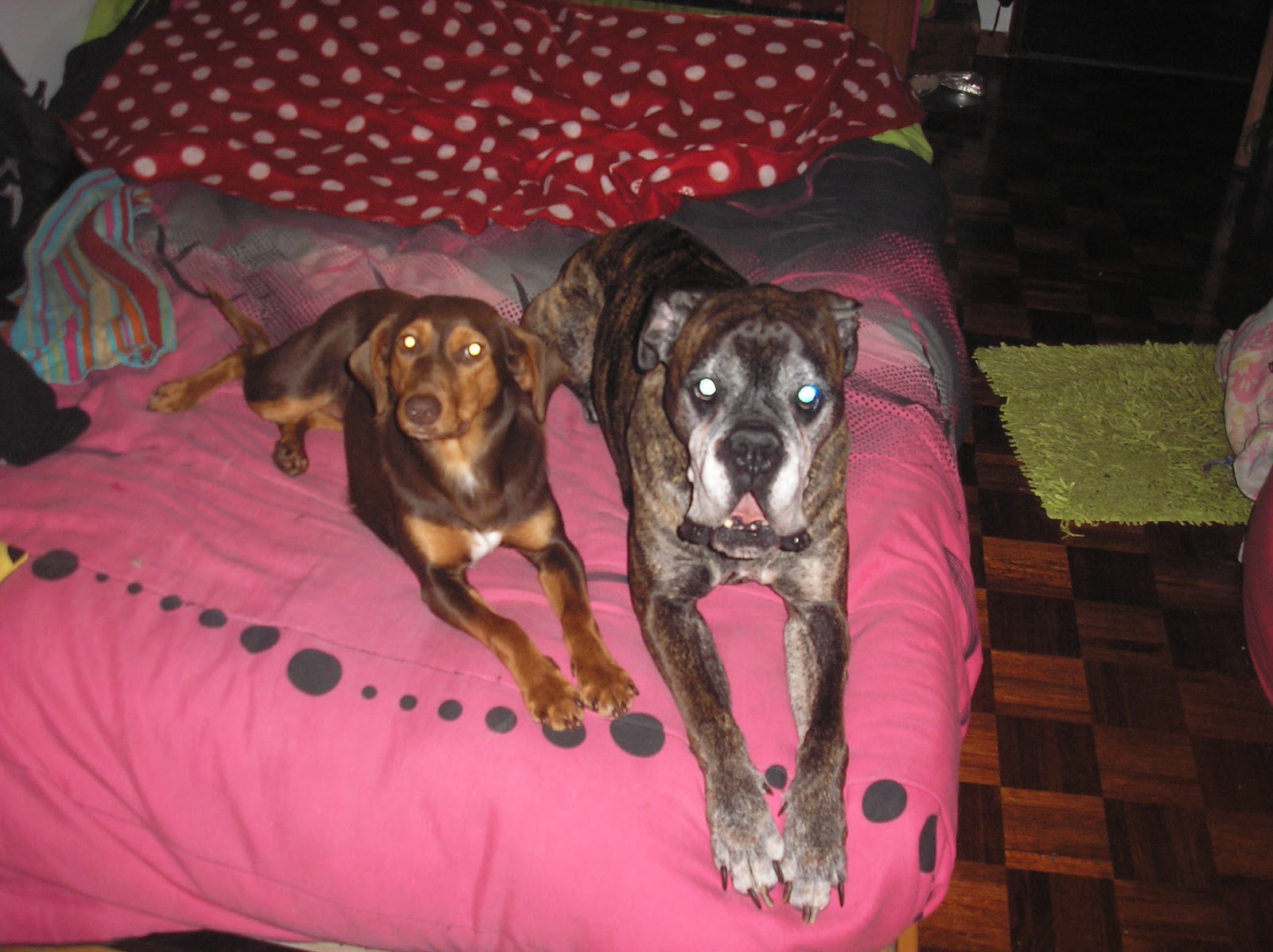 "Cá estamos nós a dar novidades. Começando pelo primeiro dia, quando ela chegou, estava bastante assustada, deu uma rosnadelazita no primeiro encontro com o Rocky (cão que já cá vivia), e refugiou-se na cozinha; na 2ª hora, foi ao quarto de uma das donas buscar um ténis e levou-o para junto dela na cozinha... ehehe... Nas horas seguintes, investigou a casa toda e arranjou ninho no sofá, mas ainda fugia do Rocky. Nos dias seguintes, toleravam-se e, há uma semana e uns dias, tem sido isto que está nas fotos: correrias um atrás do outro, ela a morder-lhe os tornozelos e orelhas... e ele impávido =))